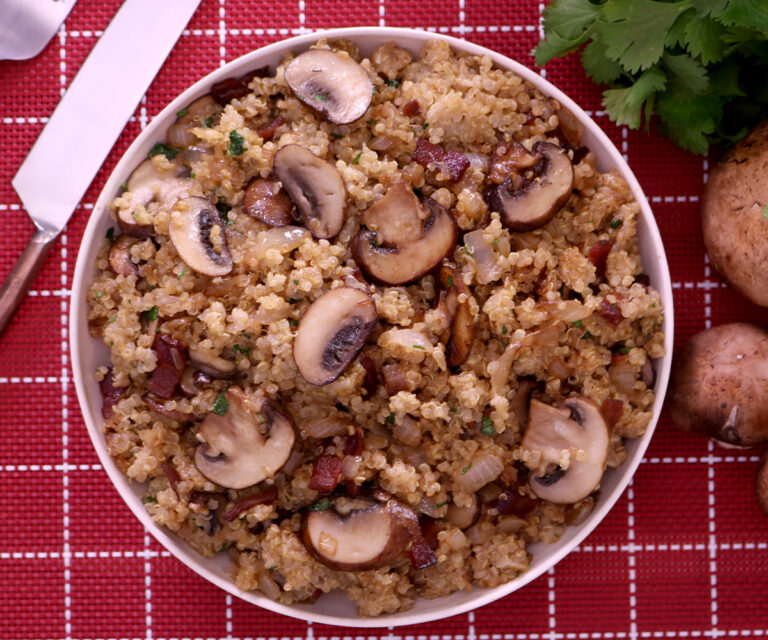 Meanwhile, in a skillet add the olive oil, heat, add the bacon and cook until golden brown. Add the onion and cook until tender and golden. Add the mushrooms and cook until tender. Add the Worcestershire sauce, browning sauce, quinoa and sautΓ© for several minutes and add the chopped fresh cilantro and season to taste.