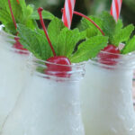 - En un vaso mezcla y macera las hojas de yerba buena con el azúcar. Luego vierte en la licuadora eléctrica y añade las berry medley congeladas y el resto de los ingredientes y mezcla hasta que quede cremoso.