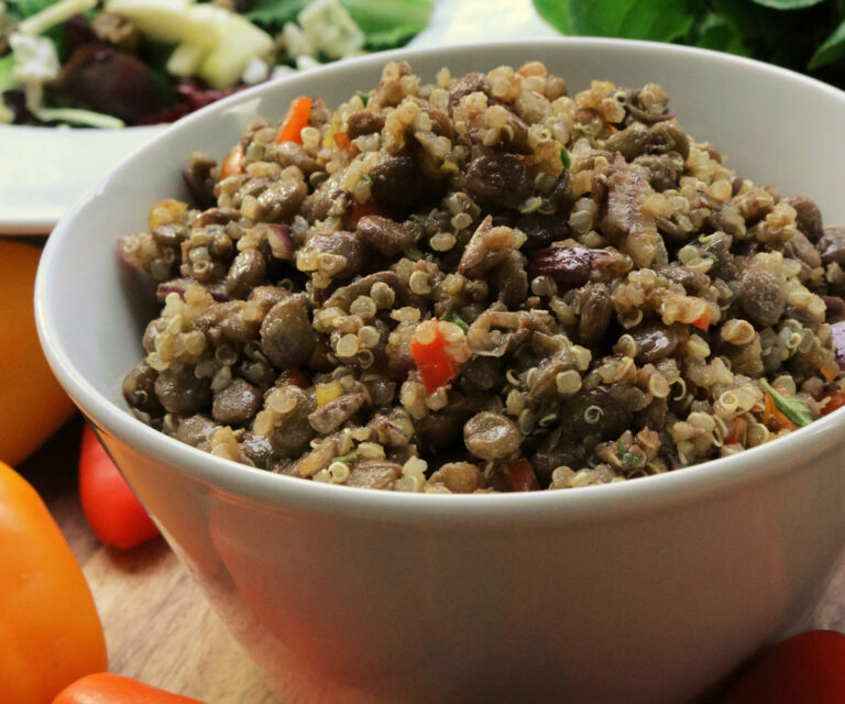 En una ensaladera echa la quinoa, las lentejas y el resto de los ingredientes y sazona al gusto.