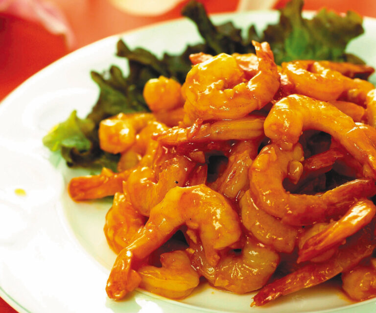 En un sartén grande o “wok” echa un chorrito de aceite de maíz, calienta y echa los camarones y saltea a temperatura mediana por 3 minutos. Deja aparte. Echa otro chorrito de aceite de maíz, calienta, echa la cebolla, guisantes, zanahorias y saltea por 2 a 3 minutos. Añade los camarones y la salsa.