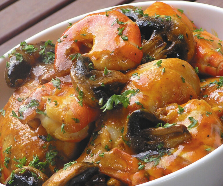 En la misma cacerola echa la cebolla, pimiento rojo, ajo, tomate, setas y cocina a temperatura mediana por 5 minutos. Echa la harina, pollo, vino, hierbitas, azafrán, sazona al gusto, tapa y cocina por 20 minutos. Añade los camarones y cocina por 10 minutos.