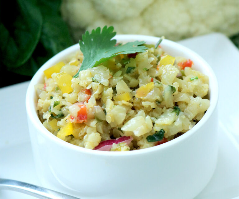 NOTE: To make the cauliflower rice, remove the green stems and chop the cauliflower and grind it in the processor, just for a few seconds so that it is not so fine. You can shred to taste, depending on how thick you like it.