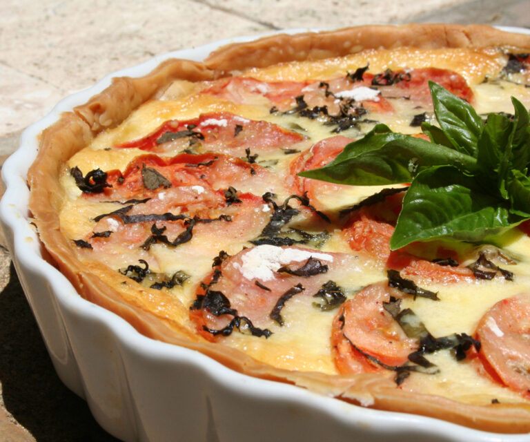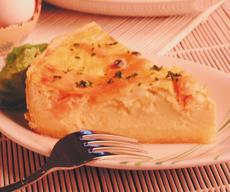 Place “pie” dough in 9 ”pie pan and pinch edges. Place the cheeses on top of the dough, then top with the sauteed onions, smoked salmon, and capers. Mix the eggs with the light cream, mayonnaise, salt, pepper to taste and pour over the onion.
